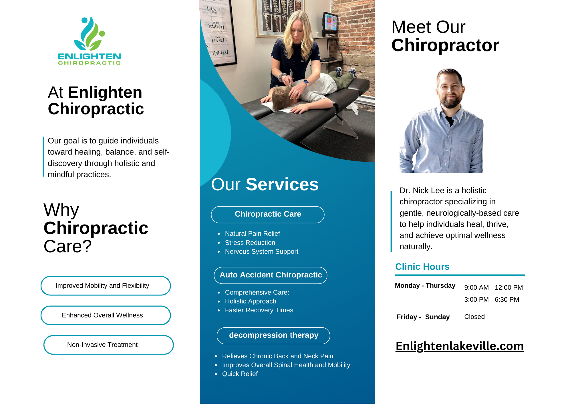 Enlighten Chiropractic in Lakeville, Minnesota, provides gentle, personalized care to help with back and neck pain, stress, and injuries from accidents. Led by Dr. Nick Lee and Dr. Brielle Egilson, we focus on finding and treating the root cause of health issues. We aim to restore overall well-being and enhance patients' quality of life. Our specialized Lakeville Chiropractic Care includes decompression therapy, pregnancy and pediatric care, and mental health support. We use non-invasive treatments to improve well-being and quality of life. If you're looking for natural ways to feel better, we're here to help. Visit our website to schedule an appointment with us!